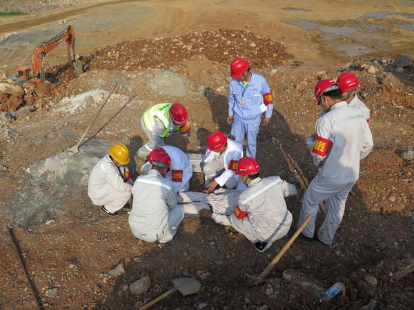 演練模擬礦山施工作業(yè)面35平臺(tái)進(jìn)行爆破作業(yè),由于炮孔充填深度不夠,導(dǎo)致沖孔現(xiàn)象,產(chǎn)生飛石,現(xiàn)場(chǎng)管理人員在礦區(qū)北側(cè)警戒時(shí),被爆破飛石砸中,導(dǎo)致腿部受傷,傷勢(shì)嚴(yán)重。總指揮在接到救援電話后,立即啟動(dòng)三級(jí)應(yīng)急預(yù)案,通知辦公室、各應(yīng)急小組就位。礦山應(yīng)急救援隊(duì)員攜帶專業(yè)救援裝備,駕駛應(yīng)急救援車,拉警報(bào),火速趕赴事故現(xiàn)場(chǎng)。到達(dá)現(xiàn)場(chǎng)后,立即判斷受傷人員傷情,及時(shí)救出并進(jìn)行止血包扎、固定等簡(jiǎn)單處理后由救援隊(duì)員用擔(dān)架抬上120救護(hù)車,并送往就近醫(yī)院救治。演練過(guò)程中各應(yīng)急小組各司其職、協(xié)同作戰(zhàn)、反應(yīng)迅速,整個(gè)演練過(guò)程在快速、緊張、有序的氛圍中進(jìn)行,圓滿完成了各項(xiàng)預(yù)定任務(wù)。    此次放炮應(yīng)急預(yù)案演練貼近實(shí)戰(zhàn)、分工明確、行動(dòng)迅速、救援工作有條不紊地執(zhí)行。既督促企業(yè)落實(shí)安全主體責(zé)任,指導(dǎo)提高員工的安全隱患意識(shí)和管理能力,確保了黃槽坊礦山的整體安全,又達(dá)到了檢驗(yàn)礦山應(yīng)急救援小組的實(shí)戰(zhàn)和應(yīng)對(duì)突發(fā)事件的應(yīng)急處置能力的目的,更進(jìn)一步檢驗(yàn)了預(yù)案的可操作性和針對(duì)性,為今后突發(fā)生產(chǎn)安全事故下熟練完成救援任務(wù)打下了堅(jiān)實(shí)的實(shí)戰(zhàn)基礎(chǔ)。