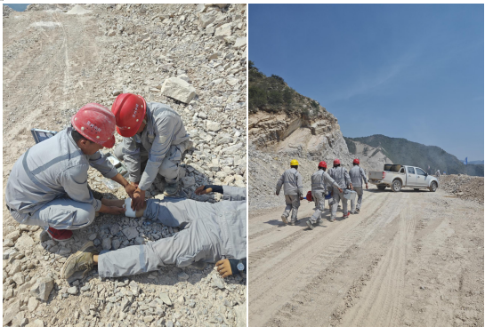 此次演練是模擬爆破后,爆破作業(yè)人員進入爆破作業(yè)區(qū)域確定是否有無盲炮,由于爆破震動產(chǎn)生巖體松動,爆破作業(yè)人員躲閃不及被落石砸傷,導致無法起身。事故發(fā)生后,分公司立即上報并啟動放炮事故應急預案,循序開展救援。