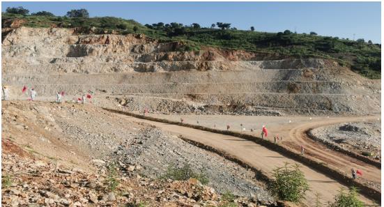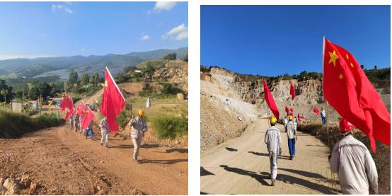 唱完國歌,員工們在項目經(jīng)理及各黨員的帶領(lǐng)下,每人領(lǐng)取了一面國旗和旗桿,興致勃勃的向礦區(qū)走去。